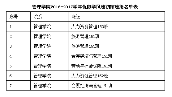 根据《成都信息工程学院关于进一步加强学风建设的实施意见》(成信校发[2016]107号)和《成都信息工程大学“优良学风班”、“十佳学风班”评选办法》(成信校发[2016]108号)文件精神和要求,经各班自主申报,辅导员审核,学院评审工作小组开会研究决定,同意2015级人力资源管理3班、2015级旅游管理1班、2015级旅游管理3班、2015级会展经济与管理1班、2015级劳动与社会保障1班、2016级人力资源管理2班、2016级会展经济与管理1班获评2016-2017学年优良学风班,具体名单详见《2016-2017学年优良学风班初审班级名单表》。如对公示情况有任何异议,请于2017年12月10日下午3点前与betway88西汉姆联联系。联系人:杨妮丹,联系电话:84833385。