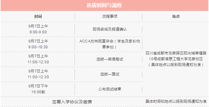 报名入读ACCA方向班的学生,需参加学院组织的选拔测试(英语笔试与面试,无费用)。