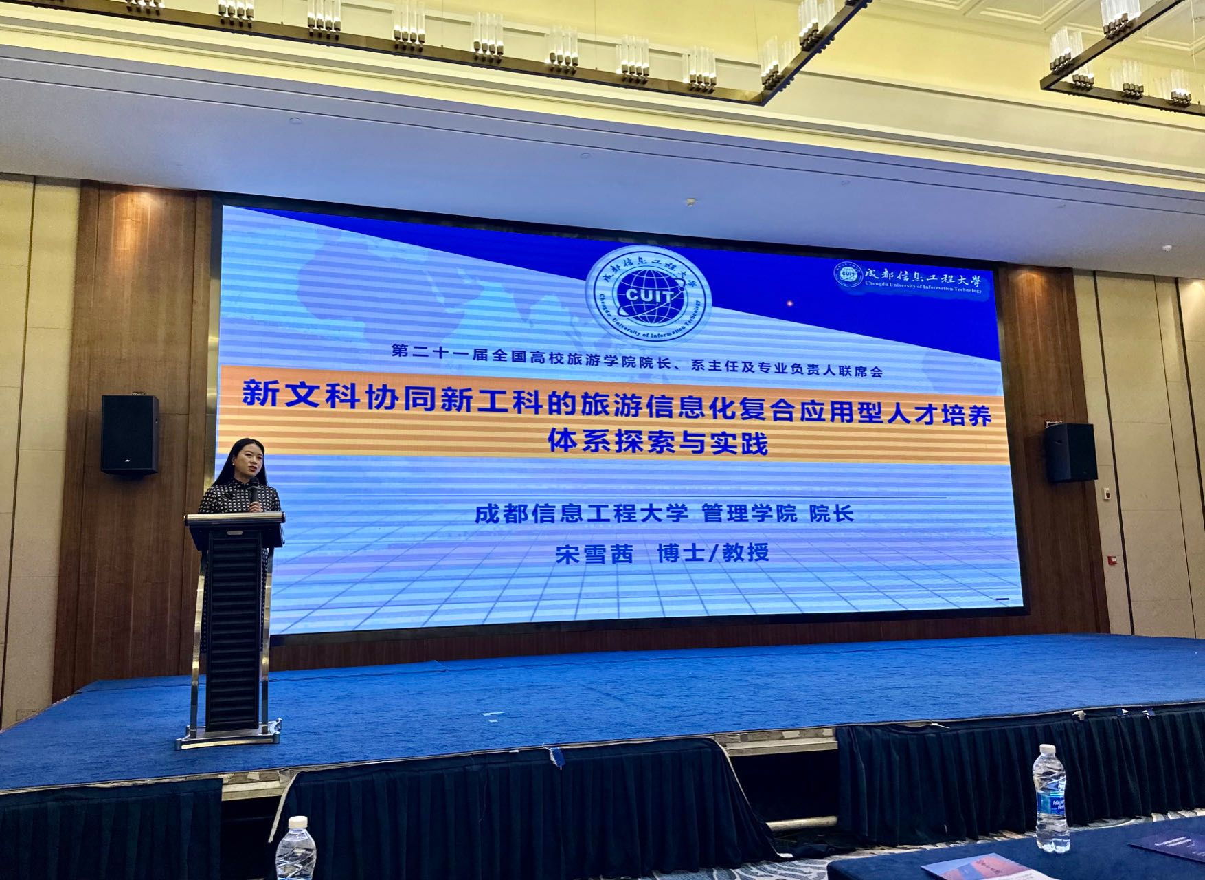 会议期间,宋雪茜院长受邀进行了主题演讲,以“新文科协同新工科的旅游信息化复合应用型人才培养体系探索与实践” 为题目,介绍了我院以国家和地方战略需求为导向,校内与信息类学科融汇交叉,校外与业界知名企业深度合作,培养旅游信息化复合应用型人才的经验,从学科交叉培养特色、“1+N”旅游信息化融合课程体系、“三维三层、动态递进”实践培养体系、“三全育人”下的“五联合”协同培养新路径等方面介绍了我院工文交叉、产教融合的旅游信息化人才培养体系,受到与会专家学者们的高度评价。