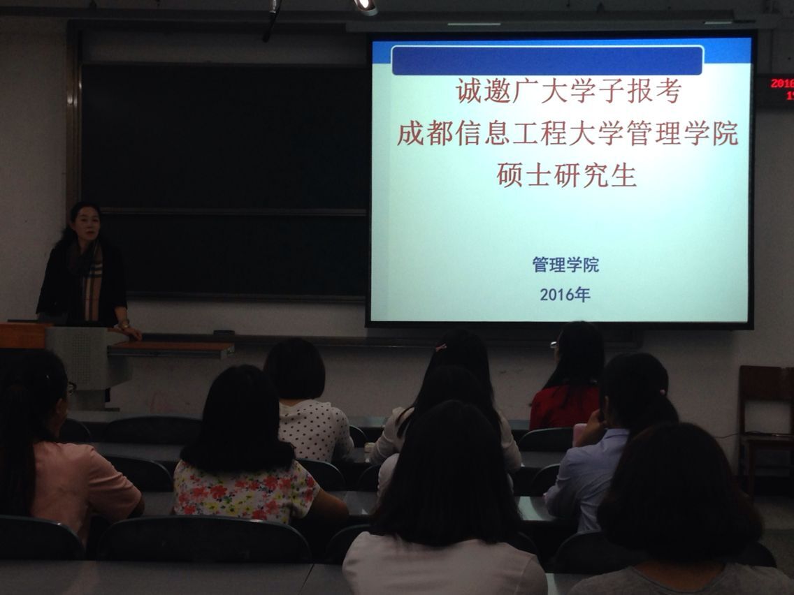 黄萍就我校的硕士研究生信息从三大方面给同学们进行了深入的讲解:一是介绍我校办学历程和硕士点建立和发展情况。充分说明了我校的办学理念紧贴需求,在服务行业和地方发展中正不断进步。二是详细介绍betway88西汉姆联硕士点举办情况。目前,betway88西汉姆联举办了管理科学与工程1个学科硕士点以及灾害管理工程、项目管理、信息资源管理、旅游管理工程、组织创新与知识管理5个二级学科硕士点和1个农学专业硕士领域农村科技组织与服务,并谈到了这些硕士点未来发展趋势,同时对我院杰出导师和学科平台进行了介绍,充分展示了我院强大的师资力量和办学实力。三是介绍了研究生奖助政策。欢迎同学们积极报考betway88西汉姆联研究生,极大鼓舞了同学们的热情。