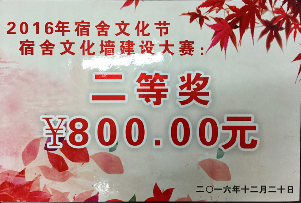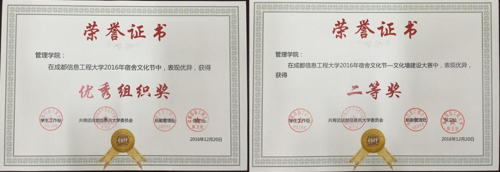 2016年11月至12月,成都信息工程大学举办题为“同一个室界 同一个梦想”2016年宿舍文化节。全校共有1301个寝室,6400余同学参与该项活动。我院获得优秀组织奖,宿舍文化墙建设二等奖,“爱寝大作战”寝室风采一等奖1项、三等奖1项,创本院参加校宿舍文化节最佳成绩。