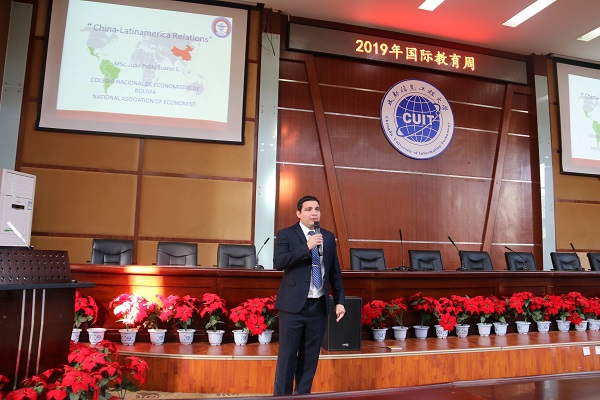 10月16日下午,玻利维亚经济学专家Juan Pablo Suarez应邀莅临我校国际教育周,在龙泉校区学术报告厅为我校师生带来题为“China-Latinamerica Relations”的学术讲座。betway88西汉姆联院长黄萍、副院长李贵卿及betway88西汉姆联学院近三百名师生聆听了讲座。