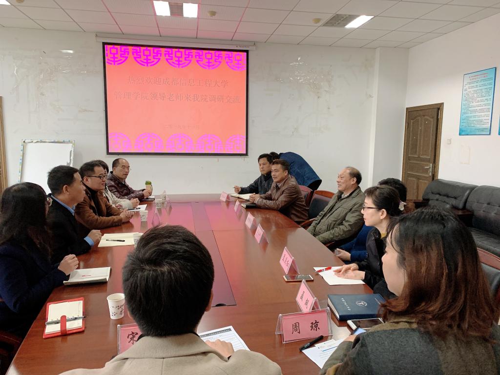2019年11月25日下午成都信息工程大学betway88西汉姆联学工队伍一行六人在学院党委副书记李璘来的带领下来到中南财经政法大学经济学院进行党建工作与学生工作调研座谈会。调研工作在经济学院会议室举行,经管学院党委书记陈勤舫、院长李小平、党委副书记詹万明、学工办主任周琼、党务秘书宋昀宜、教工党支部双带头人陈立兵教授等八人,我院党委副书记李璘来、教工党支部书记刘军、学生科科长刘宇及辅导员徐同、陈祖伟、刘吕林参加了会议。