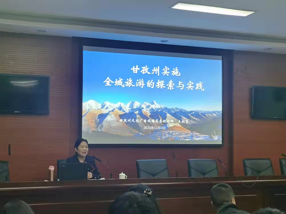 王秋蓉围绕全域旅游“是什么、为什么、做什么、怎么做”四大方面展开讲座。她以甘孜州为例,全方位解析了甘孜州发展全域旅游的条件、优势和意义,并对“十四五”期间甘孜州按照“三环一带两湿地”的总体布局加快全域旅游建设的思路、目标及重点突破进行了图文并茂的生动阐述,特别是以川藏铁路的修建为契机,展现了甘孜州全域旅游发展的美好前景。