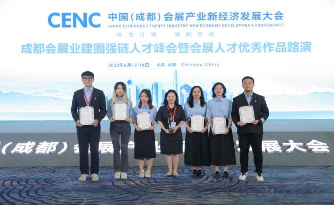 6月18日,大会重要配套活动——成都会展业建圈强链人才峰会暨会展人才优秀作品路演在大会主会场拉开,本次优秀作品大赛共有来自四川大学、四川农业大学、成都大学等十余所院校的64支队伍总计280名同学参与。其中由我校谢雅丹老师指导的“奋进六人行”团队作品——“聚焦新路径,共享新场景”2022中国(成都)首届公园城市美好生活大会”策划案通过角逐入围最终路演。在比赛现场上,参赛同学准备充分、表现惊艳,给评委留下深刻印象,最终取得第三名的优异成绩,为我校争光添彩!