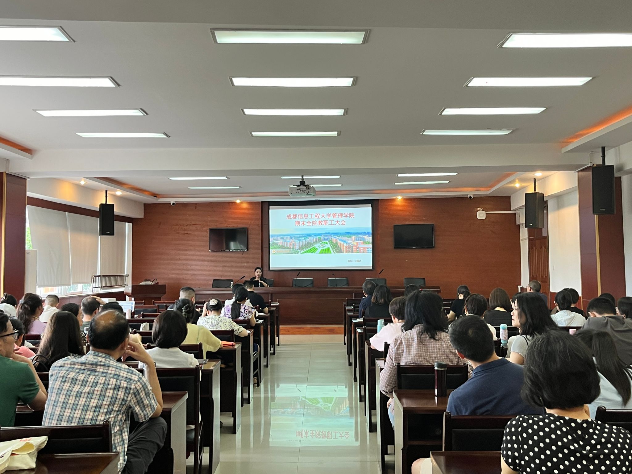 2023年7月7日下午,我院在龙泉校区第二会议室L1213召开期末全院教职工大会,对本学期工作进行总结,并对下学期相关工作进行部署。会议由学院院长宋雪茜主持,领导班子及全院教职工参加了本次会议。