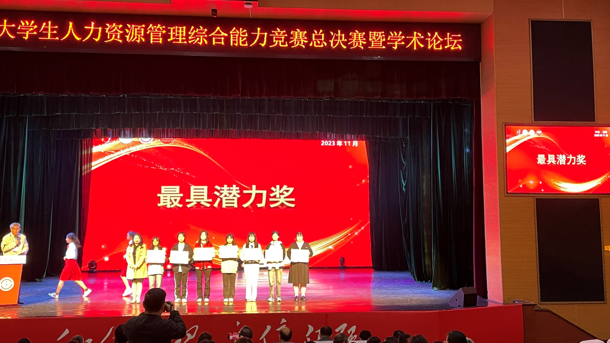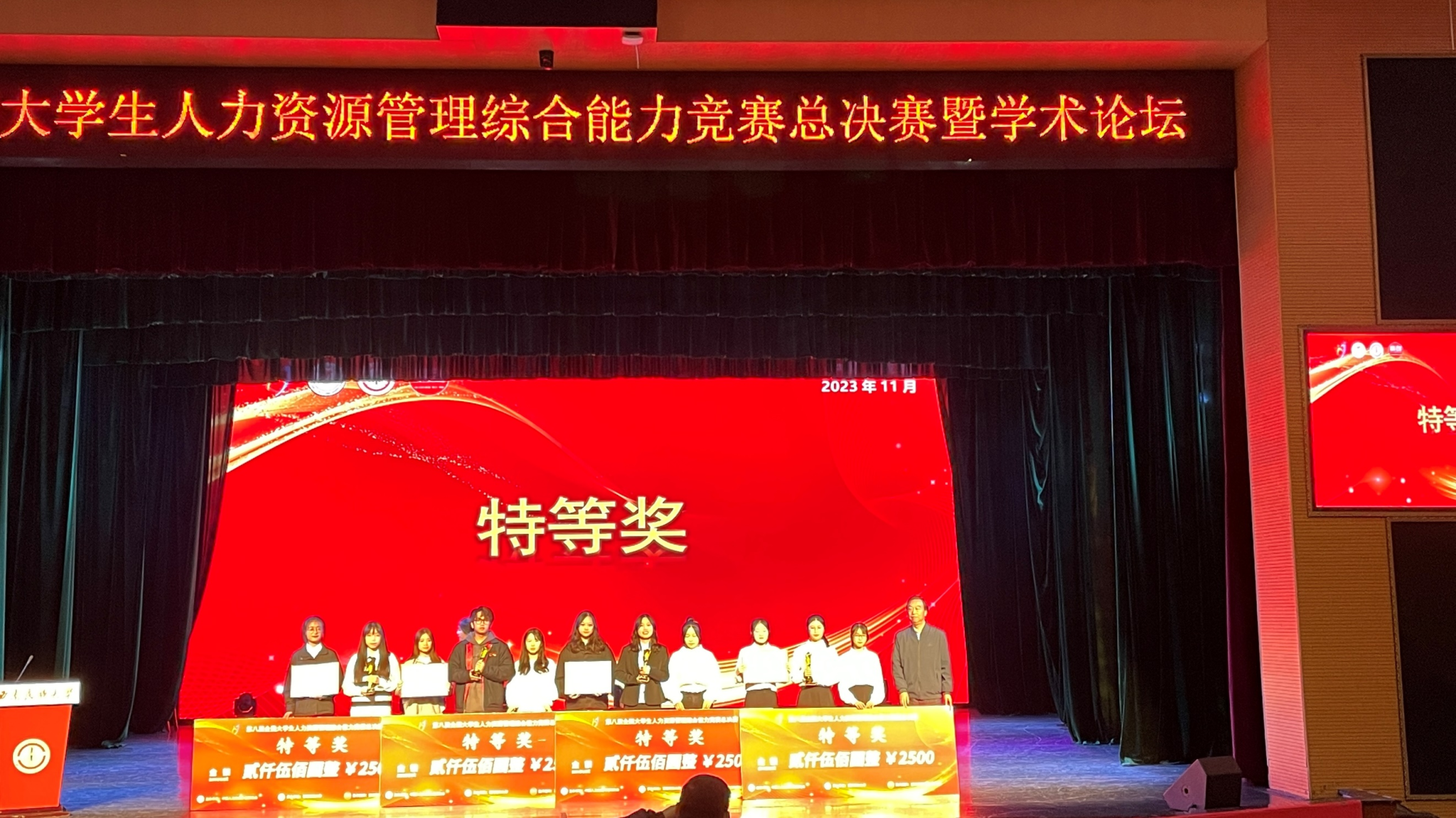 2023年11月11至12日,我院人力资源管理专业的徐雨晴、陈胤君、乔弛三位同学组队参加了第八届全国大学生人力资源管理综合能力竞赛总决赛,经过HR模拟经营及HR职业实战两个环节的比赛,获得了“特等奖”的优异成绩,并同时获得“最具潜力奖”。