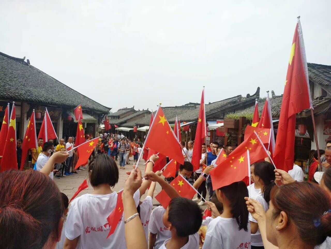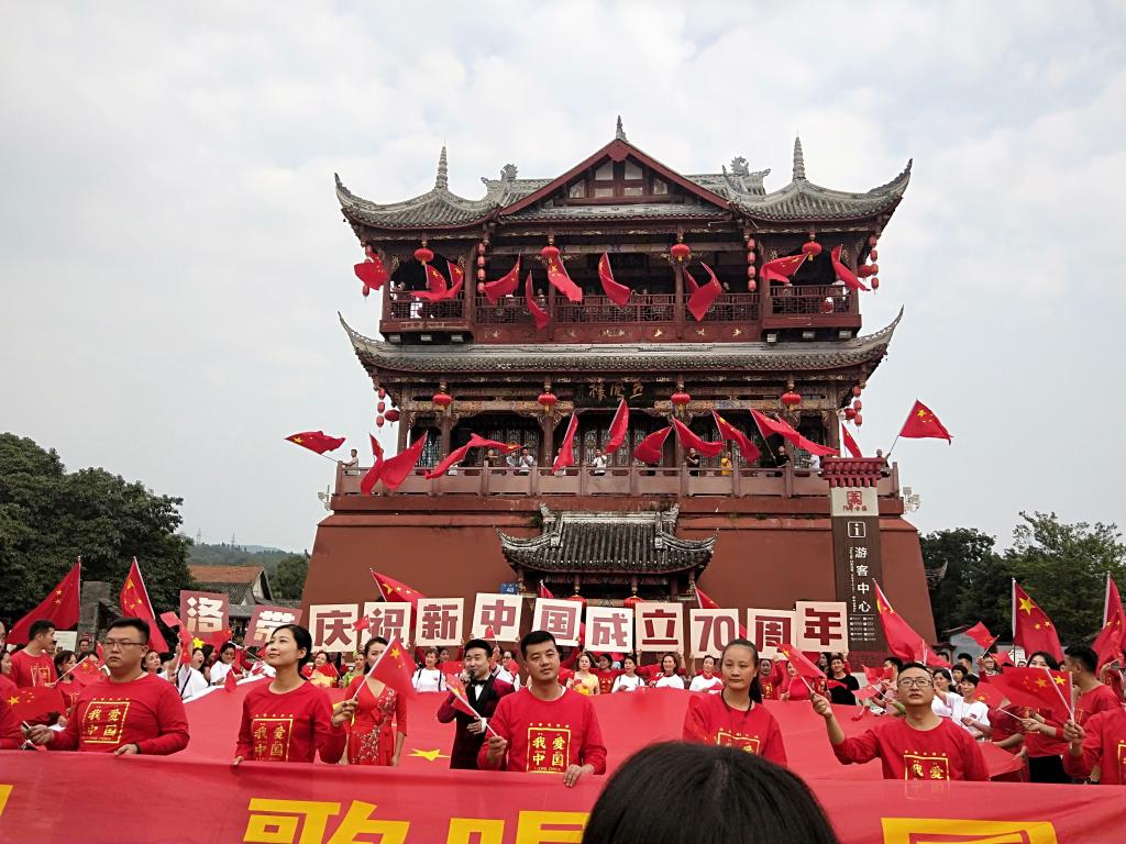 最后,志愿者们来到五凤楼,红旗招展,到处洋溢着喜悦与幸福,人们纷纷与国旗合影,在主持人的带领下,大家齐声高喊:祖国,我爱你!祖国,万岁!洛带人民给祖国的献礼。
