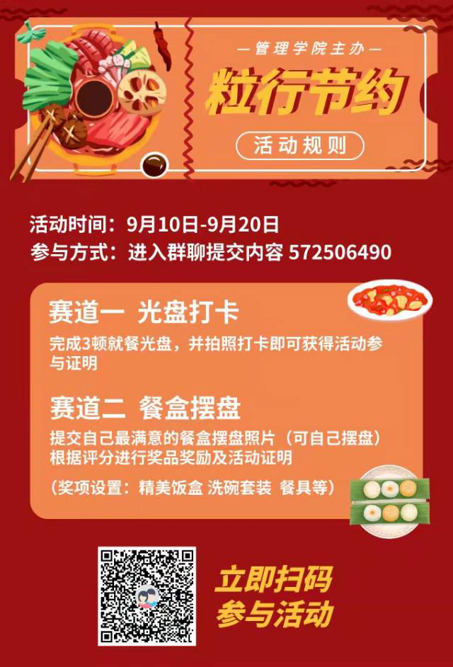 【光盘行动活动】为贯彻习近平总书记对制止餐饮浪费行为做出的重要指示精神,2020年9月10日—2020年9月20日生活部在线上开展了光盘行动,管院学生会活动部举办“光盘打卡,成信学子在行动”活动。本次活动采取线上光盘打卡和晒最美餐盘两个形式,共118位获奖者。在活动前采取线上转发说说的宣传方式,活动后期进行了总结、写新闻稿等结尾工作,于9月20日活动收官。