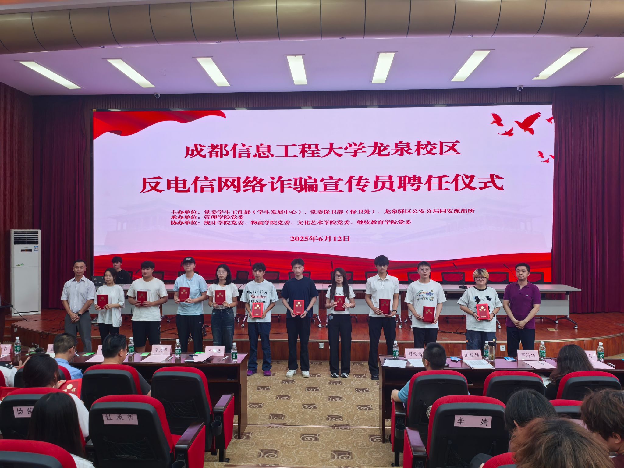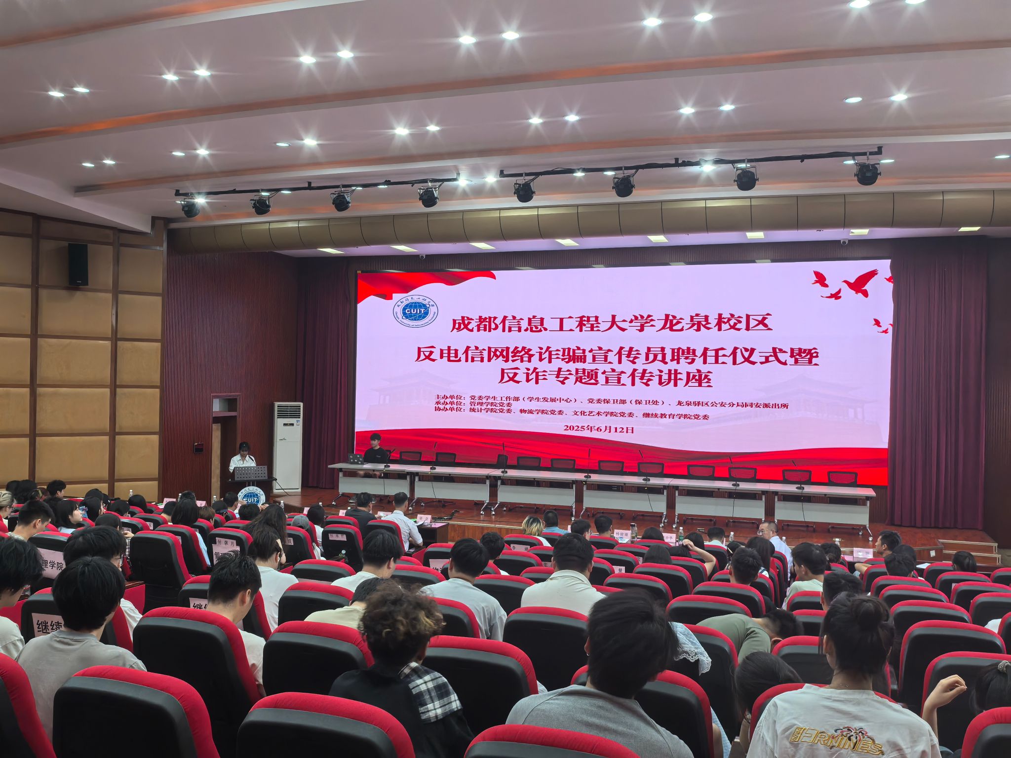 6月12日下午,由学校党委学生工作部、党委保卫部、龙泉驿区公安分局同安派出所主办,betway88西汉姆联党委承办,龙泉校区其他学院党委协办的反电信网络诈骗宣传员聘任仪式暨反诈专题宣传讲座,在龙泉校区三教二楼学术报告厅举行。龙泉驿区公安分局刑警大队唐杰警官、同安派出所所长赵胜等嘉宾,学校党委学生工作部副部长梁念、党委保卫部副部长李文华、betway88西汉姆联党委书记刘敦虎、以及各学院学生科科长、教师代表参加,吸引了龙泉校区270余名学生。