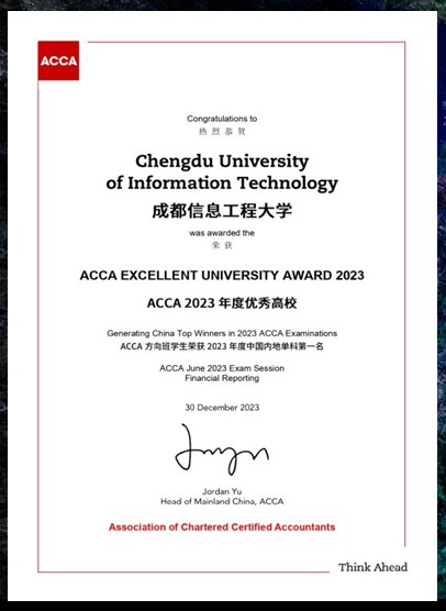热烈祝贺成都信息工程大学获得ACCA官方 ACCA2023年度优秀高校