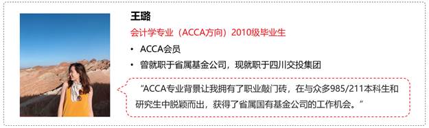 会计学专业国际实验班(ACCA)学生未来将拥有广阔的就业选择面,可在大型跨国公司、专业性会计师事务所、大型国企与金融机构等从事财务、税务、商业分析、投融资、运营与管理等各类高薪职业。