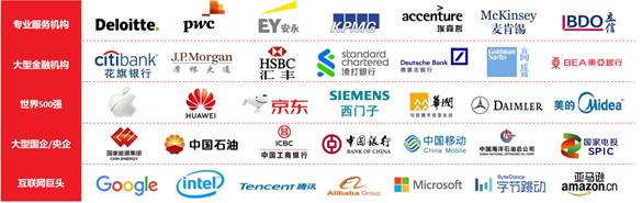 埃森哲(中国)有限公司、香港汇丰银行/中国汇丰银行深圳分行、安永会计师事务所、普华永道会计师事务所、毕马威华振会计师事务所、德勤会计师事务所、天职国际会计师事务所、建设银行、招商银行、工商银行、国家税务局、中铁二局集团、阿里巴巴等 |