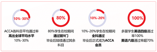 历届学生专业成绩优异,英语能力突出,且ACCA各科目通过率大部分均高于全球同期通过率10%至30%。