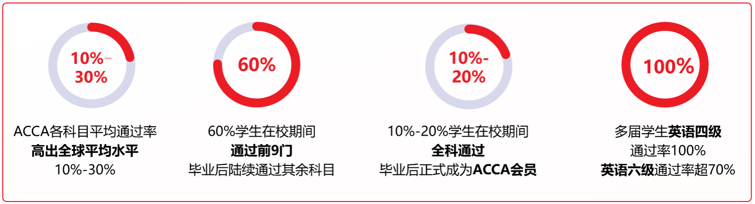 历届学生专业成绩优异,英语能力突出,且ACCA各科目通过率大部分均高于全球同期通过率10%至30%。