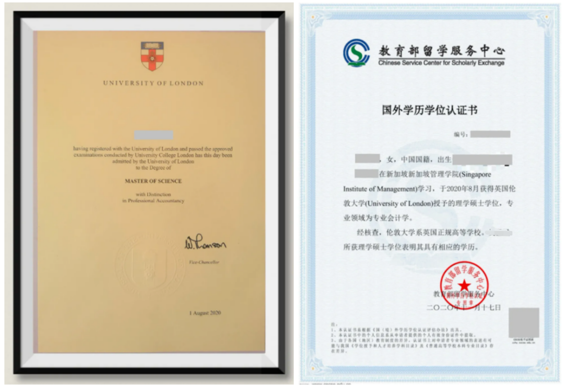 伦敦大学专业会计硕士文凭及教育部学历学位认证书