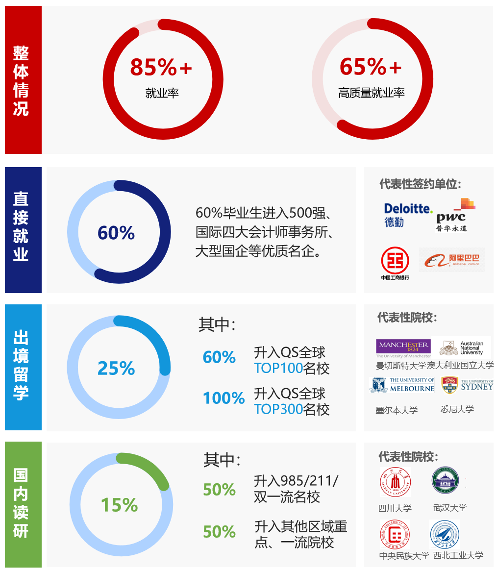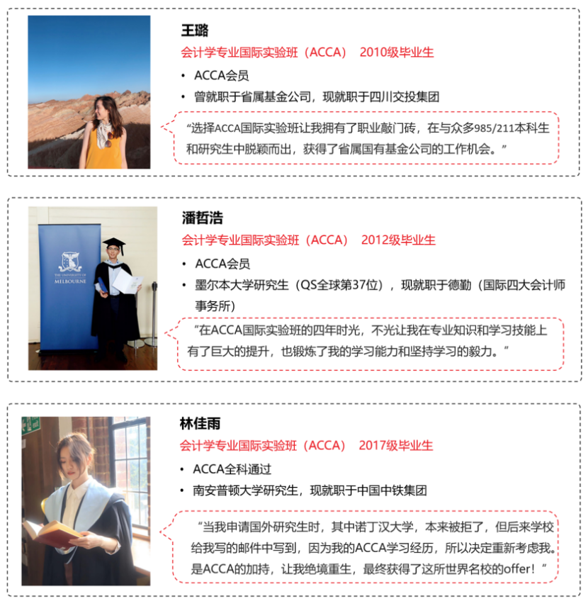 会计学专业国际实验班(ACCA)学生未来将拥有广阔的就业选择面,可在跨国公司、专业性会计师事务所、国企与金融机构等各类大型企事业单位从事财务、税务、商业分析、投融资、运营与管理等高薪职业。