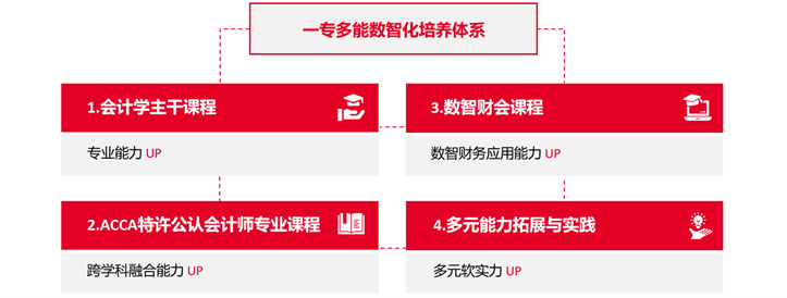 会计学专业(ACCA方向)聚焦新兴技术应用下财会专业学生的核心素养与技能,以当前全球大型企事业单位用人需求为导向,搭建起“会计学主干课程+ACCA专业课程+数智财会课程+多元能力拓展与实践”的一专多能数智化培养体系,教学由浅入深、循序渐进,课程内容先进、覆盖面广、综合性强,聚焦会计、金融、财务管理、智能财务应用等学科交叉领域,旨在培养熟练掌握国内外会计、审计准则及相关法规,精通财经英语与智能财务应用,熟悉商业运行整体逻辑,具备跨学科整合能力、全球化视野与前瞻思维,综合素质拔尖的未来型数智财会人才。