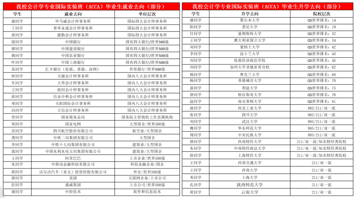 毕业生就业率高,就业质量好。入职名企的同学,大部分入职四大会计师事务所、大型国企、500强等优质名企,出国留学的同学,大部分进入世界TOP100名校留学深造,国内升学的同学,部分考取国内985/211/双一流高校研究生。