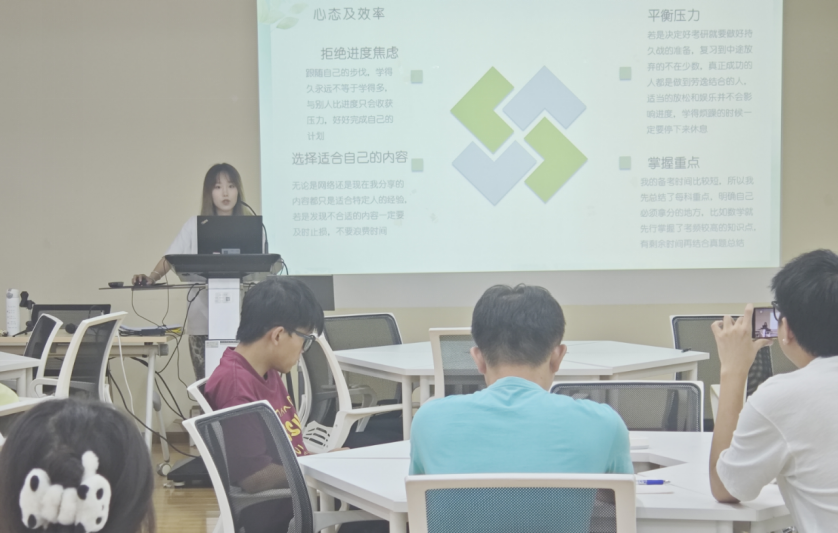 在考研分享环节,拟录取为2025级会计硕士的邹依岑结合自身备考经历,从时间管理、复习方法、心理调适等方面分享了考研经验。