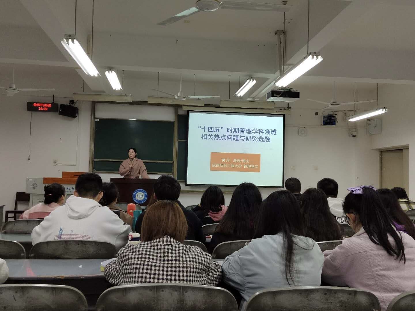 10月27日晚,在L2102教室,betway88西汉姆联院长黄萍教授给2021级农业管理、管理科学与工程专业的同学们进行了“‘十四五’时期管理学科领域相关热点问题与研究”的专题讲座。