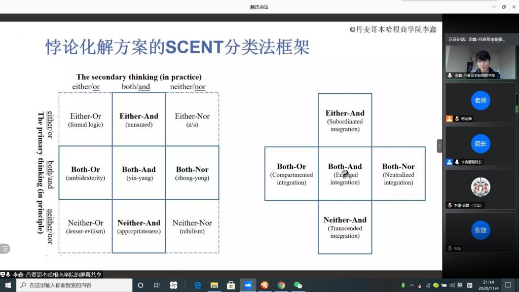 讲座主要围绕什么是管理悖论、中西会通的含义、整合多种管理悖论化解方法、多种思想对构建悖论化解方法的影响等几个方面,深入的讲解了现今关于管理悖论的主要思想理论与发展状况。李鑫基于自身对于管理悖论的研究出发,从三大悖论、怎样进入到管理悖论研究领域、黑格尔辩证法、阴阳哲学理论对于研究悖论是否合适等方面,系统解读了如何整合已有的和潜在的多种管理悖论理论、从宏观与微观方式形成的逻辑模型,讲述了西方思想对于构建SCENT分类法的影响,又介绍了多种研究方法,既有模型的形象构造、又有自身经历的列举,对大家之后系统的学习理论并且融合中西文化有很好的指导作用。