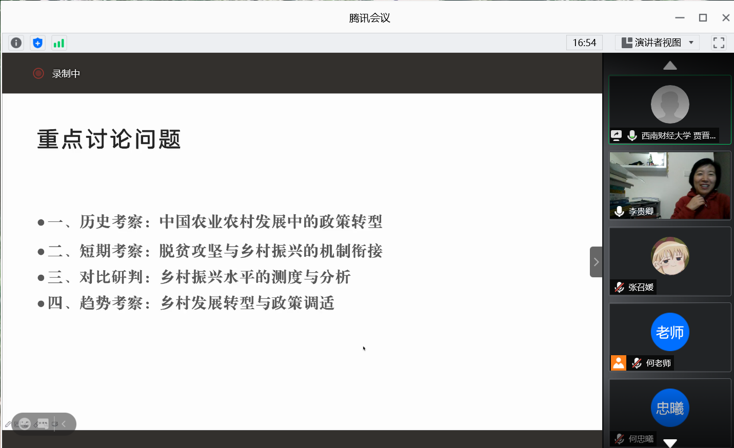 讲座主要围绕乡村转型和政策调适的历史、现实和趋势等几个方面,深入的讲解了决胜脱贫攻坚、加强乡村文化建设助力乡村振兴的时代性和紧迫性。贾晋以中国农业农村发展中的政策转型历史为主线,从脱贫攻坚与乡村振兴的机制衔接的短期考察、乡村振兴水平的测度与分析方面、乡村发展转型与政策调试的实际考察经验四个方面,系统解读了脱贫攻坚与乡村振兴战略相互衔接的基本要求和方法路径,既有理论高度、又有实践深度,既有宏观把握、又有具体探讨和措施,对大家之后系统的学习、加快推进脱贫攻坚与乡村振兴有效衔接具有很强的指导意义。
