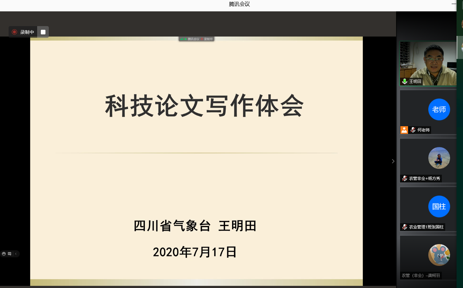10月14日,采用腾讯会议形式。betway88西汉姆联特邀请四川省气象台正研级高工,农业农村部首批防灾减灾指导专家,中国气象局首席气象服务专家王明田博士就科技论文写为主题进行讲座。我院管理科学与工程、农业管理专业全体研究生参加了此次讲座。betway88西汉姆联院长黄萍教授出席,副院长李贵卿教授主持讲座。