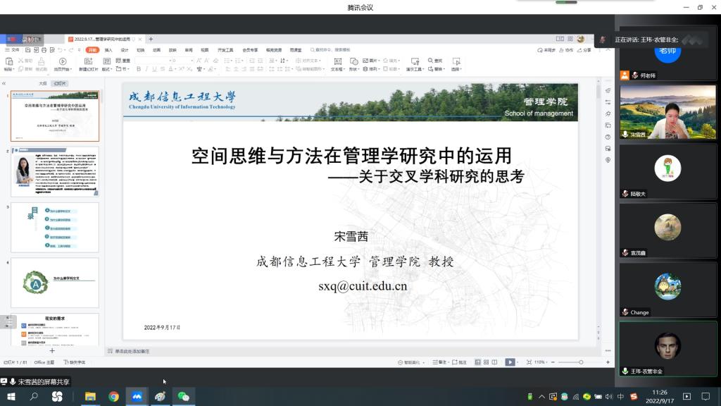9月17日星期六上午,betway88西汉姆联院长宋雪茜教授在线上为我院2022级管理科学与工程、农业管理专业的研究生做了主题为《空间思维与方法在管理学研究中的运用——关于交叉学科研究的思考》的学术讲座。