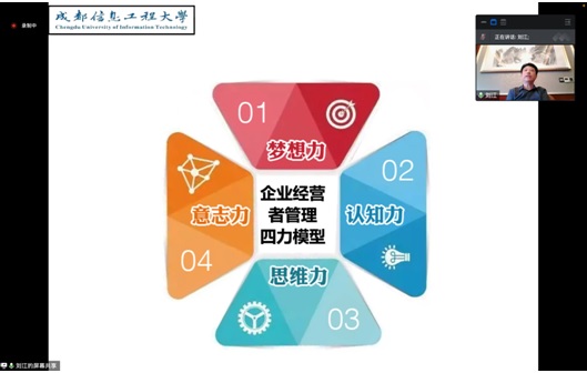 讲座围绕影响事业成功的四个因素,即:四力模型展开,包括梦想力、认知力、思维力及意志力;刘江分析了这四个因素的内涵、特征及其对于企业经营者的重要性和如何淬炼。梦想力是事业成功的前提条件,认知力是事业成功的基础条件,思维力是事业成功的决定条件,坚韧的意志力是事业成功的促进条件。成功企业经营者的一定要有梦想,梦想能扩大人的潜力,梦想需要行动;深刻认识自我认知、社会认知和群体认知,防治认知偏差,多经历、多交流、多思考、多总结增强认知力;思维力=不悔思维+成长思维,不悔思维包括目的思维、系统思维、博弈思维、适度思维;意志力包括自驱力、自控力和自调力,增强意志力训练。