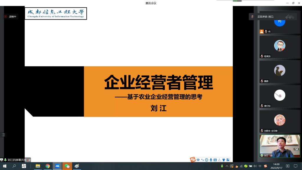 9月17日星期六下午,青岛中一集团创始人、总裁、北京大学经济政策研究所研究员、四川大学MBA企业导师/特聘教师、青岛科技大学MBA校外导师、中国消费经济学会理事、四川省旅游局特聘旅游规划专家刘江博士就“企业经营者管理—基于农业企业经营管理的思考”在线上为我院2022级管理科学与工程、农业管理专业的研究生们进行了专题讲座。