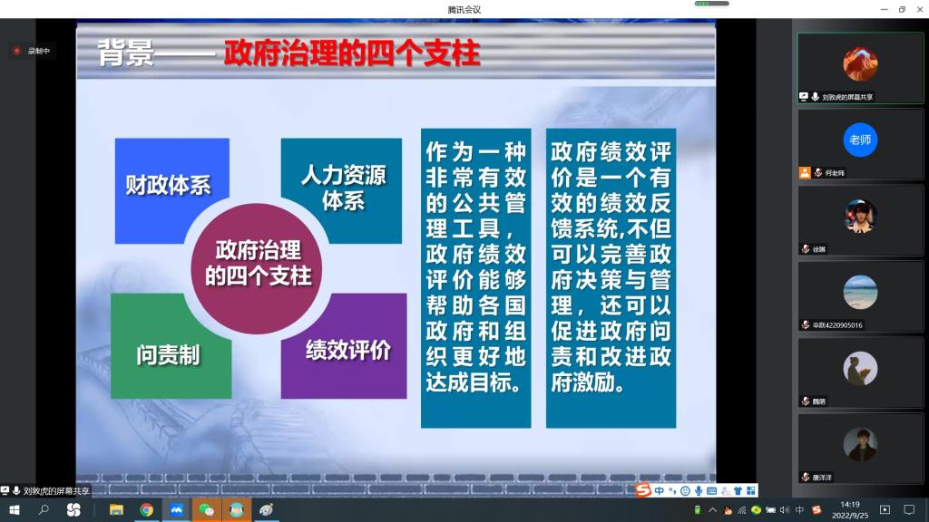 刘敦虎首先以米尔顿·弗里德曼花钱办事的四种模式理论作为引入点展开讲述,并和同学们在线上进行交流互动。他告诉同学们绩效管理作为政府治理的四个重要支柱之一,目的是打造高效、责任政府。并介绍了绩效管理的背景、发展以及特点作用。