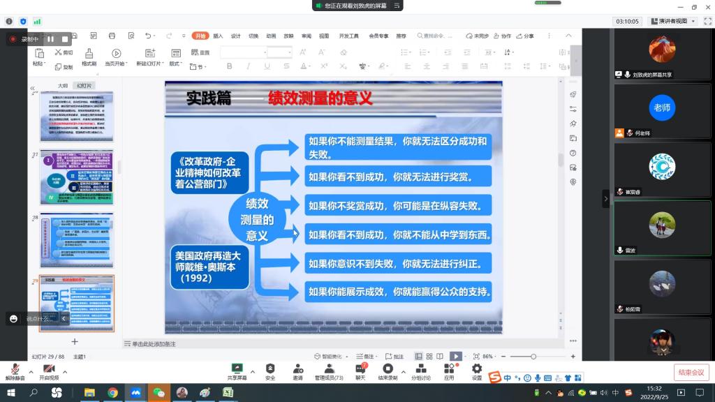 最后,刘敦虎向同学们展示了绩效管理在实践研究中的应用,告诉同学们绩效评价结果对国家政府的治理影响很大,正确客观的进行绩效管理显得尤为重要,并且鼓励同学们多学习多了解,拓宽自身的知识面,与会研究生受益匪浅、反响热烈。