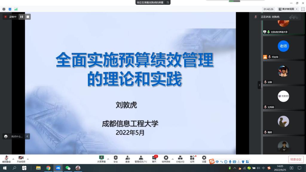 2022年9月25日下午,betway88西汉姆联党委书记刘敦虎教授在线上为我院2022级管理科学与工程、农业管理专业的研究生做了主题为《全面实施预算绩效管理的理论和实践》的专题讲座。