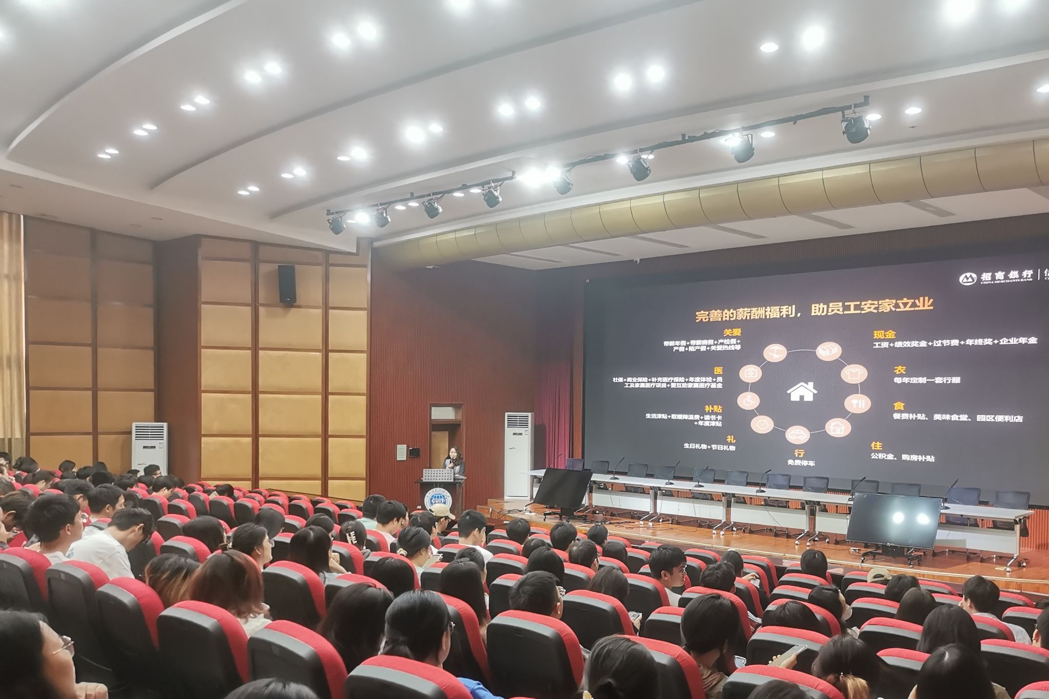 动员大会后,开启了现场招聘会。招商银行信用卡成都分中心业务主任邓石容通过企业整体情况、岗位职责、任职条件、薪酬福利、公司环境、工作亮点等为在场毕业生进行了详细介绍,分享企业专业系统、服务水平、服务文化、培训制度、课程体系,以及人才培养与晋升机制等内容,并进行现场互动,吸引大家更深入的了解招行。