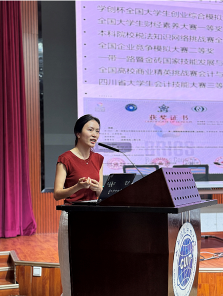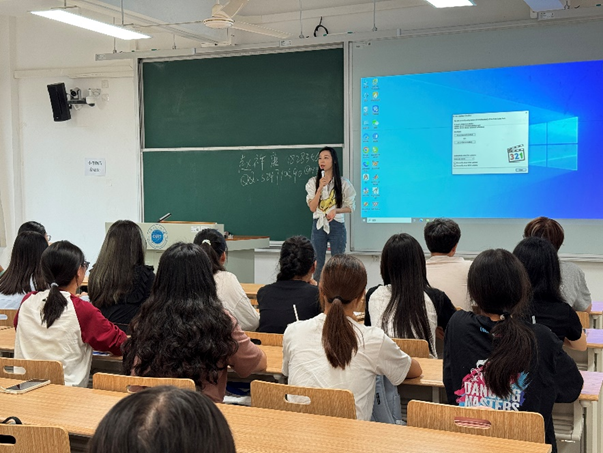 首先,财务与会计系副主任郭泓伶博士以“我的人生我规划”为题,介绍了会计与财务管理专业的职业发展前景。她指出,在数智化时代背景下,行业亟需具备业财融合及新技术应用的复合型财会人才,鼓励新生在夯实专业基础的同时,积极参与学科竞赛和创新创业训练计划,通过实践提升核心竞争力。郭老师还介绍了财务与会计系的师资情况和近年部分学生的升学、就业情况,让同学们了解到我系的专业特色,是构建“数智+双碳+会计”的智能会计人才培养生态圈。