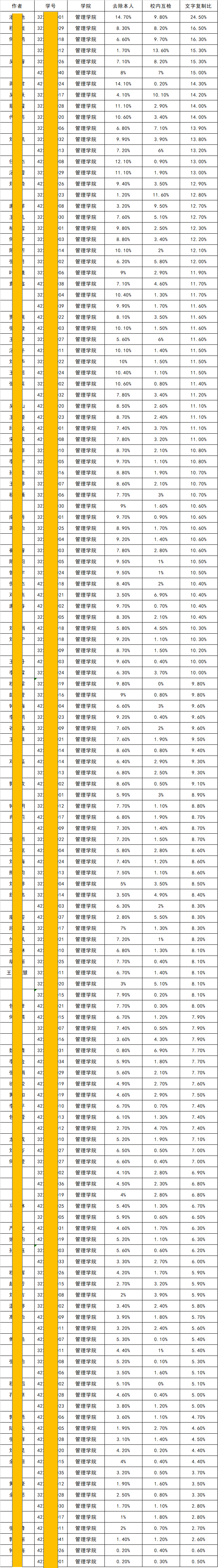 1、百分比认定(文字复制比=去除本人+校内互检)