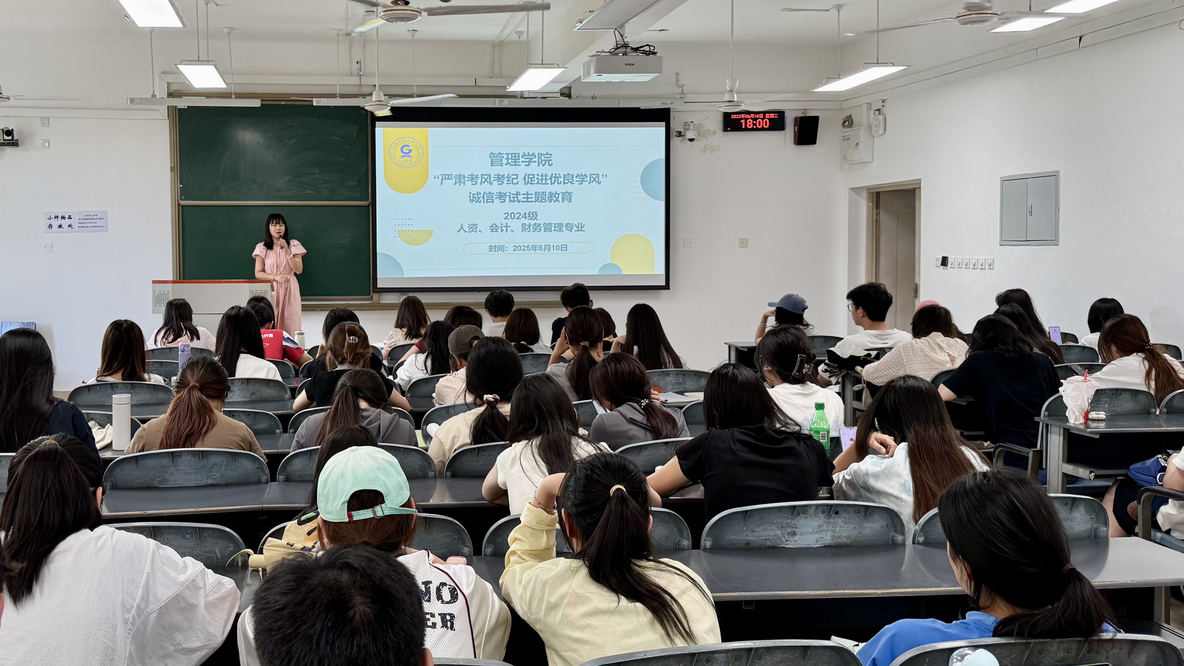 李雅婧老师开展“严肃考风考纪 促进优良学风”诚信考试主题教育宣讲,引导学生做好期末复习,诚信考试,宣读《成都信息工程大学诚信考试承诺书》,讲解违规违纪处理相关内容,全体学生集中签订承诺书,以书面形式承诺诚信应考。随后,李老师还对日常仪态着装提出规范要求,强调以良好风貌展现班级学风,助力营造严谨有序的学习氛围。