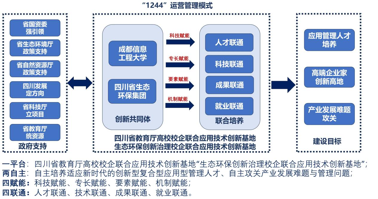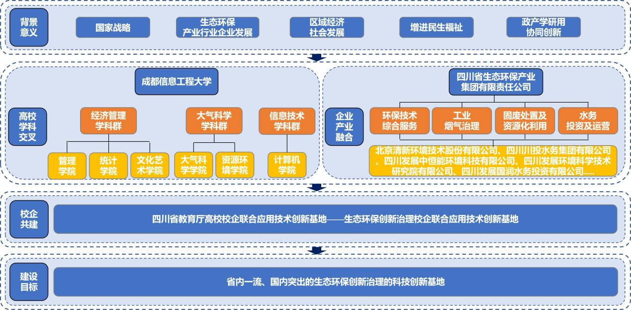 四川省教育厅高校校企联合应用技术创新基地“生态环保创新治理校企联合应用技术创新基地”(以下简称创新基地)于2025年1月获批建设,由成都信息工程大学与四川省生态环保集团联合共建。创新基地以国家、地方战略需求为指引,以生态环保行业、产业、企业需求为目标,依托学校经济管理、大气科学、信息技术三大学科群,整合校内跨学院、多学科研究优势,形成内部多学科交叉融合机制;同时,充分发挥国有大型企业在实践应用的优势,通过校企联合的途径构建政产学研用外部协同机制。将高校五大职能与国有企业任务与使用对接,形成以教育发展、科技创新、人才培养一体化发展理念指导下的“学科交叉、校企联合”内外协同技术创新机制的政产学研用战略合作体。